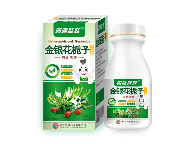 - 产品名称:金银花栀子压片糖果产品类型:压片糖果配料:山梨糖醇、金银花、栀子、菊花、青果、紫苏、淡竹叶、白茅根、蒲公英净含量:0.6g/片×80片食用方法:建议一...